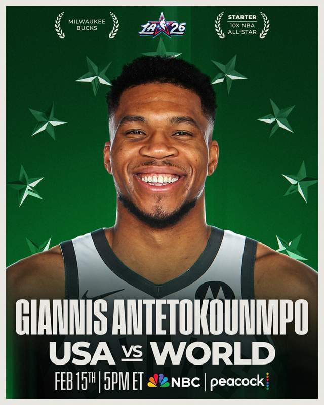 字母哥成为东部全明星首发,他是东部得票最高的球员。这是他生涯第10次入选全明星,也是连续第10年入选。赛季至今, 字母哥场均28.8分9.5篮板5.5助攻。