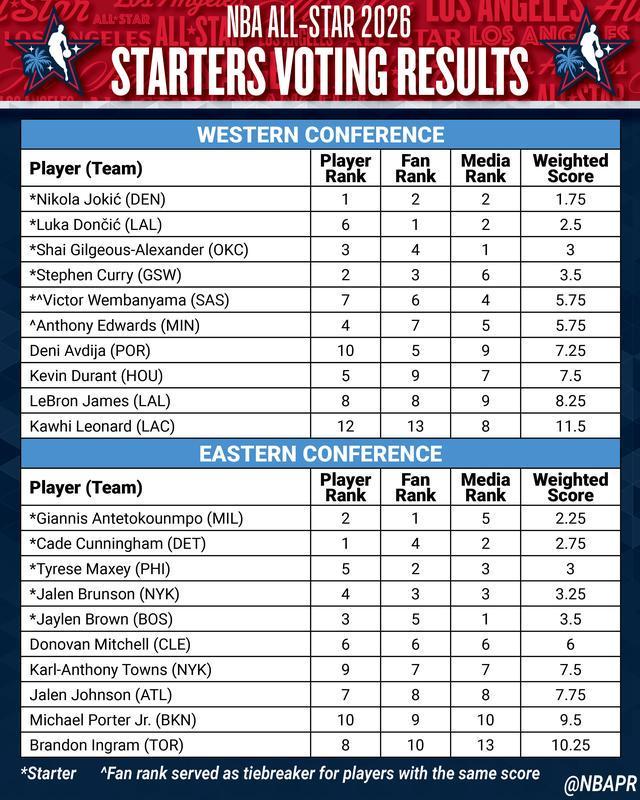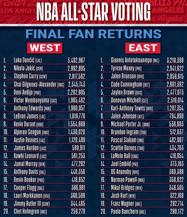 - NBA | 全明星投票结果东契奇居首,詹姆斯无缘首发一纪录终结,湖人赢了