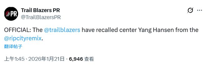 - NBA | 开拓者官方召回杨瀚森!全明星票数队内第3美媒感慨中国人气效应