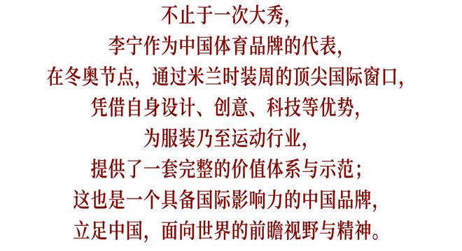 相较于众多品牌发布对于流行趋势的跟进反应,李宁此次大秀从新颖的沉浸式举办形式到不一而足的产品内核,无不体现出对于体育精神、全球体育盛会文化的深度时尚化演绎。以丰盈的品牌档案库为始,将赛场上的荣耀记忆持续转化为可穿戴的美学视觉符号;通过强大的设计创新实力,将宏大的体育精神,转译为每个人心中运动员精神的情感共鸣与认同,使其拥有更为丰富、时尚的内涵延伸。