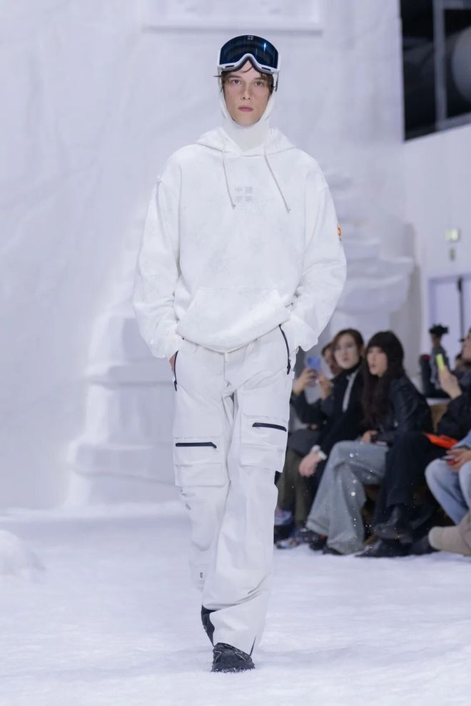来自滑雪轨迹的“月牙弯”,化作服装上的灵动线条,成为可穿戴的时髦符号;提取自专业冰球服的廓形、防护模块,形变为与潮流互通的时尚化表达;而硬核面料科技,则为专业单板滑雪运动产品提供了强有力的功能支撑。
