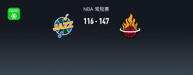 第四节爵士科利尔拿下8分,热火阿德巴约拿下10分,最终爵士116-147不敌热火