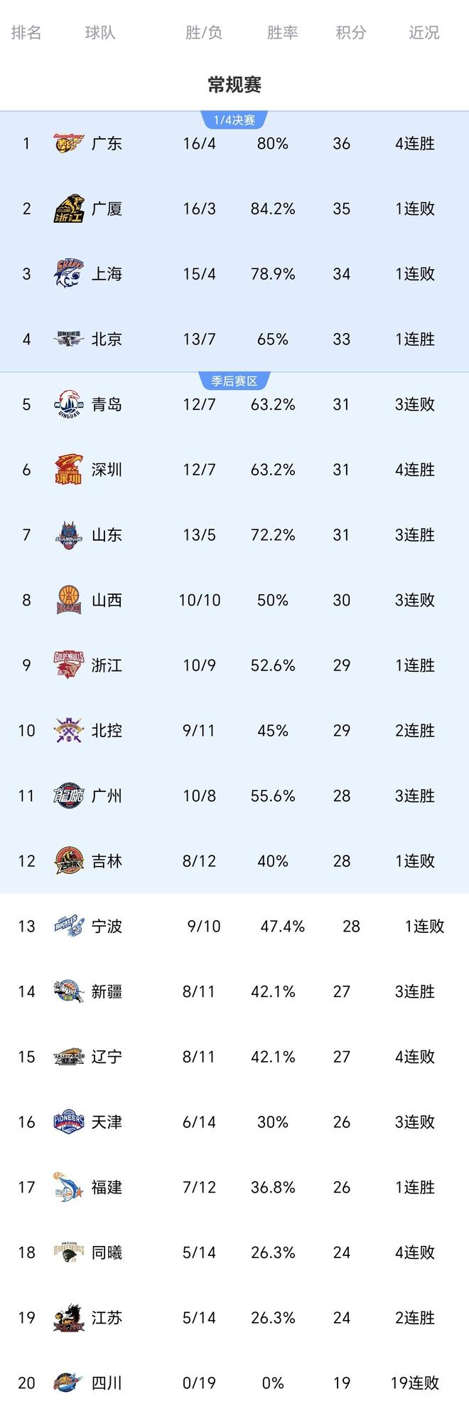 - CBA | CBA最新排名:广东队登顶第1,首钢队重回前4,辽宁跌至第15